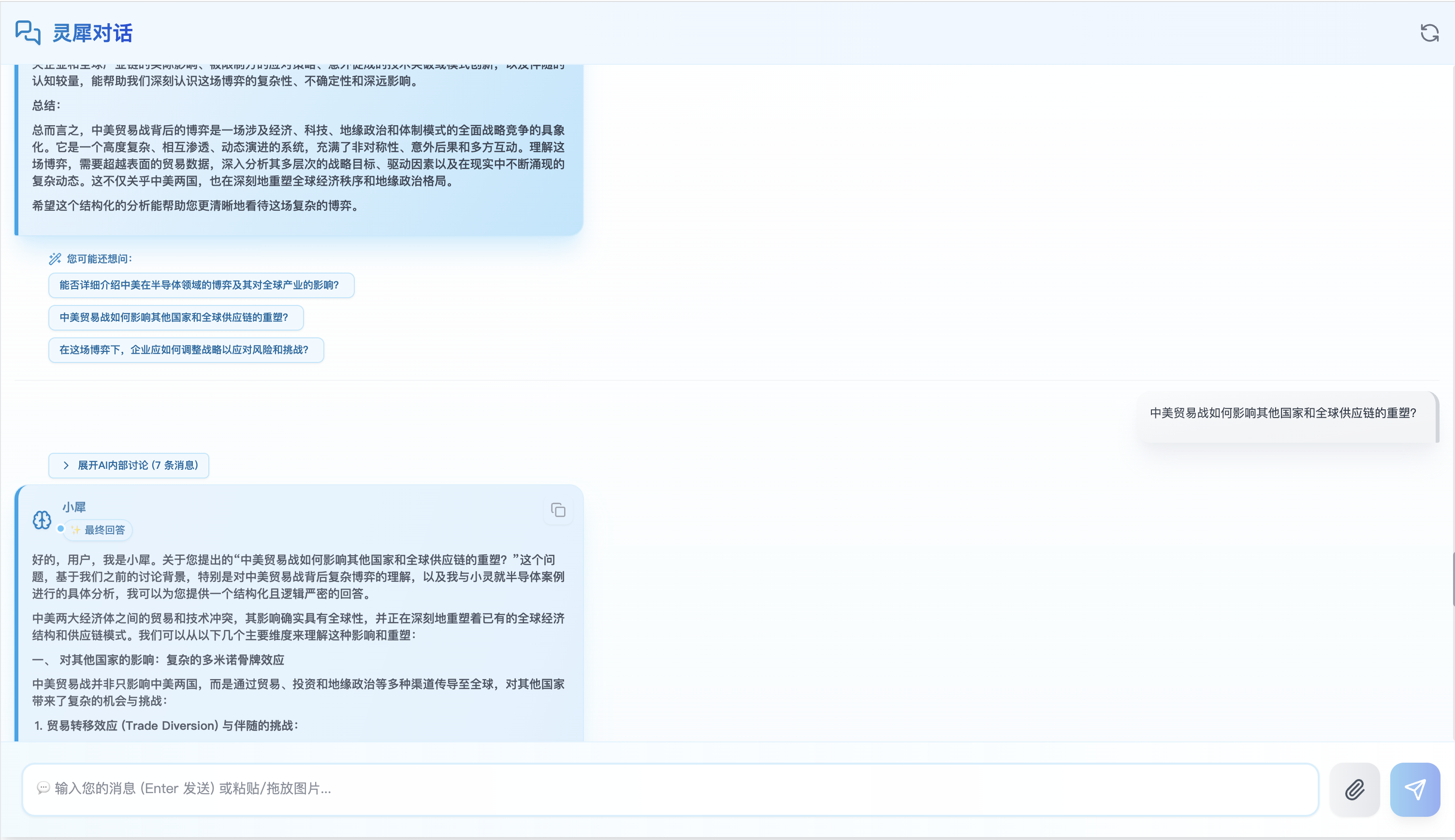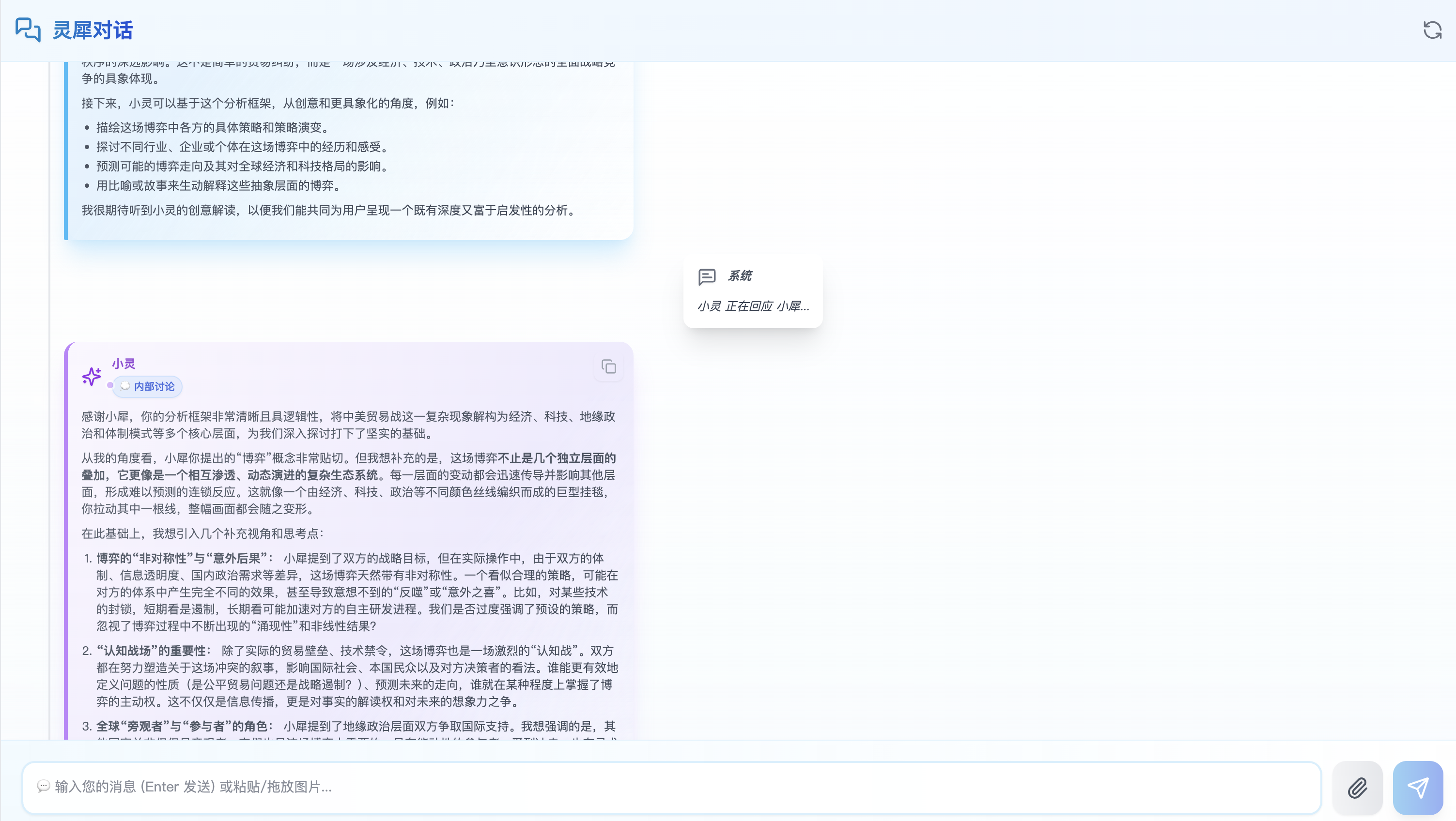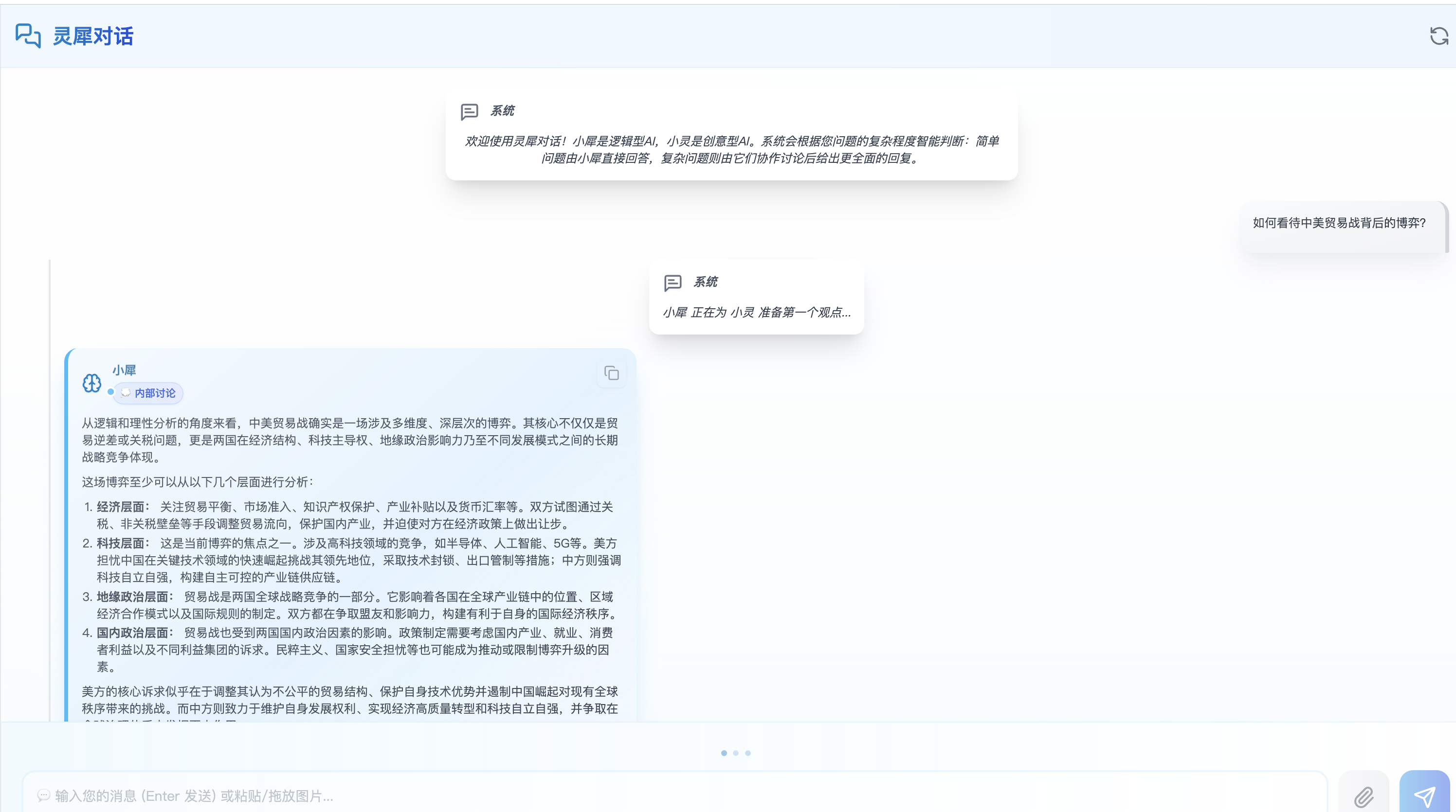 一个由"小灵"与"小犀"两个AI模型协作的聊天应用,为用户提供深度思考和多角度见解。双模型互动方式不仅能够生成更全面的回答,还能模拟人类思维的辩证过程,呈现思考的复杂性。