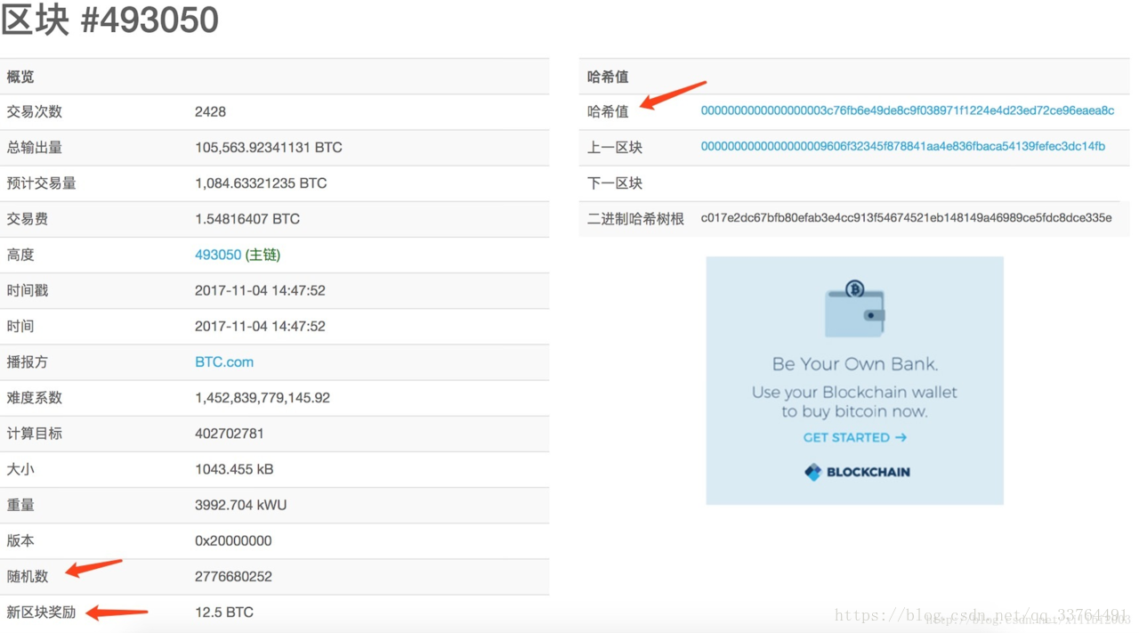 Hash值是由数字和大小写字母构成的字符串,每一位有62种可能性(可能为26个大写字母、26个小写字母,10个数字中任一个),假设任何一个字符出现的概率是均等的,那么第一位为0的概率是1/62(其他位出现什么字符先不管),理论上需要尝试62次Hash运算才会出现一次第一位为0的情况,如果前两2位为0,就得尝试62的平方次Hash运算,以n个0开头就需要尝试62的n次方次运算。我们结合当前实际区块#493050信息来看看: