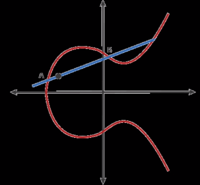 这里先说说加法吧,在椭圆加密运算中,A点加上B点是这么定义的:经过A点和B点的直线会和椭圆加密曲线上的第三个点相交,这第三个点和X轴对称的点就是A+B的结果。