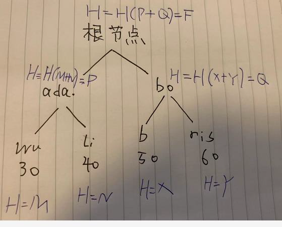 - 如果是非叶节点,那么H(leaf) = H( H(child1) + H(child2) + .. + H(childN))
