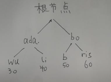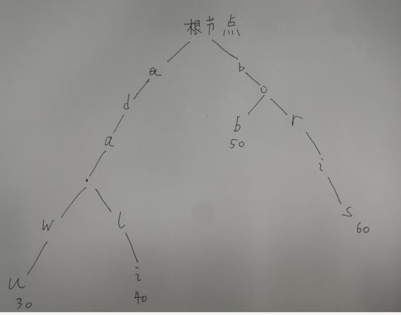 字典的最经典实现方式当然就是HashMap了,但除此之外,还有一种借助“字典树”的方案, 下图就是字典树的方式来实现上述存储: