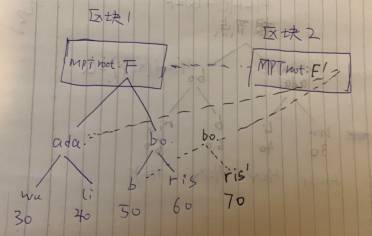 以上,就构造好了一棵MPT树,回头再来看MPT树的概念是不是就很容易理解了,实际就是merkle + trie。但是它是在以太坊中怎么用的呢,特别是根节点的哈希值,有什么用?见下文。