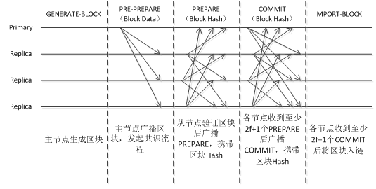 - 各节点收到至少2f+1个COMMIT消息后,将区块写入区块链(IMPORT-BLOCK)