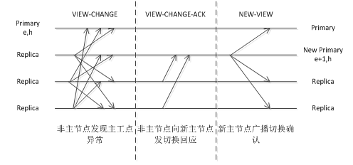 当共识在PRE-PREPARE和PREPARE阶段发生异常时,非主节点发起VIEW-CHANGE,以尝试切换主节点,在VIEW-CHANGE过程中,节点不再影响区块共识消息。主节点则不发起VIEW-CHANGE。