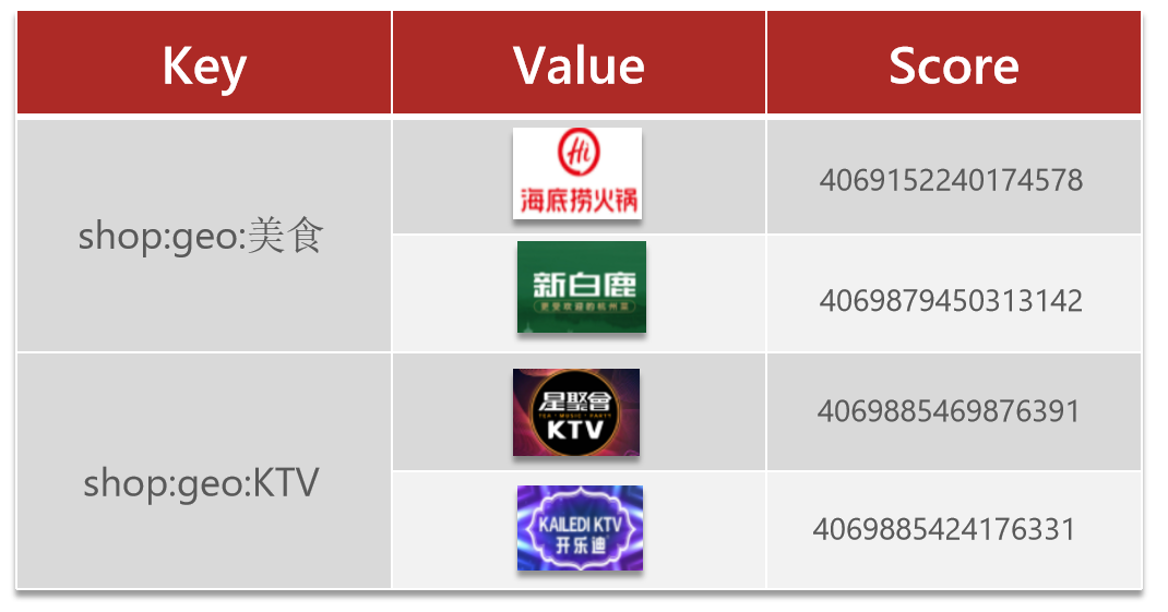 - Redis 将 geohash 作为 ZSET 的 score,地点 member 作为 key 存储。