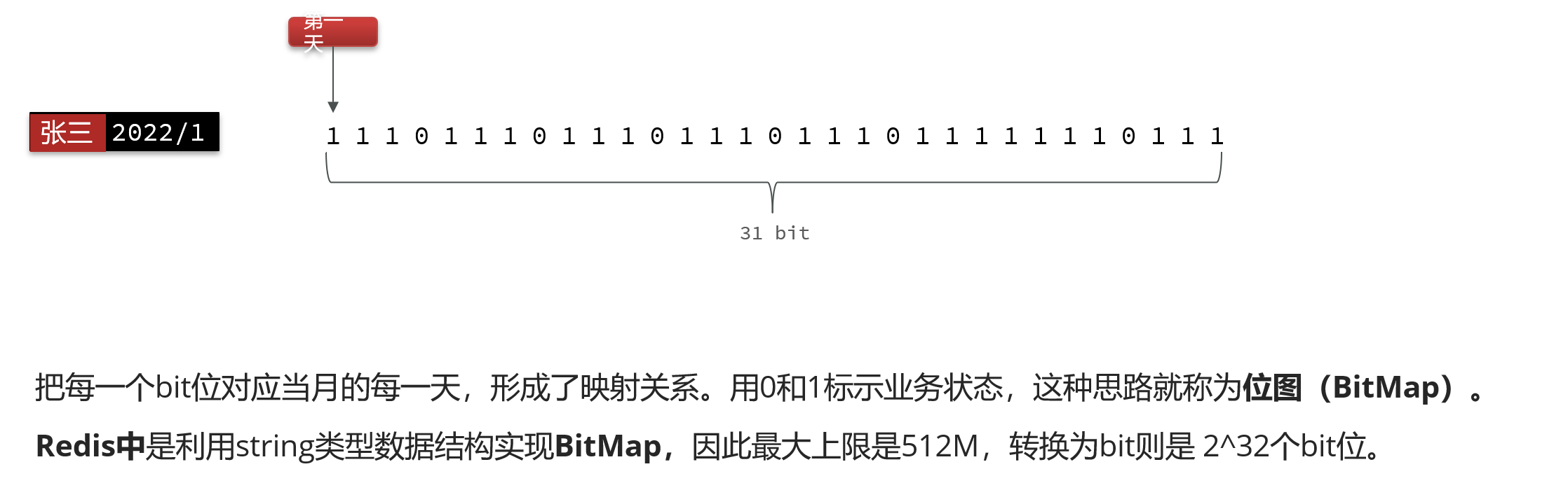 为了解决这个问题,Redis 提供了位图数据结构,这样每天的签到记录只占据一个位,365 天就是 365 个位,46 个字节 (一个稍长一点的字符串) 就可以完全容纳下,这就大大节约了存储空间。